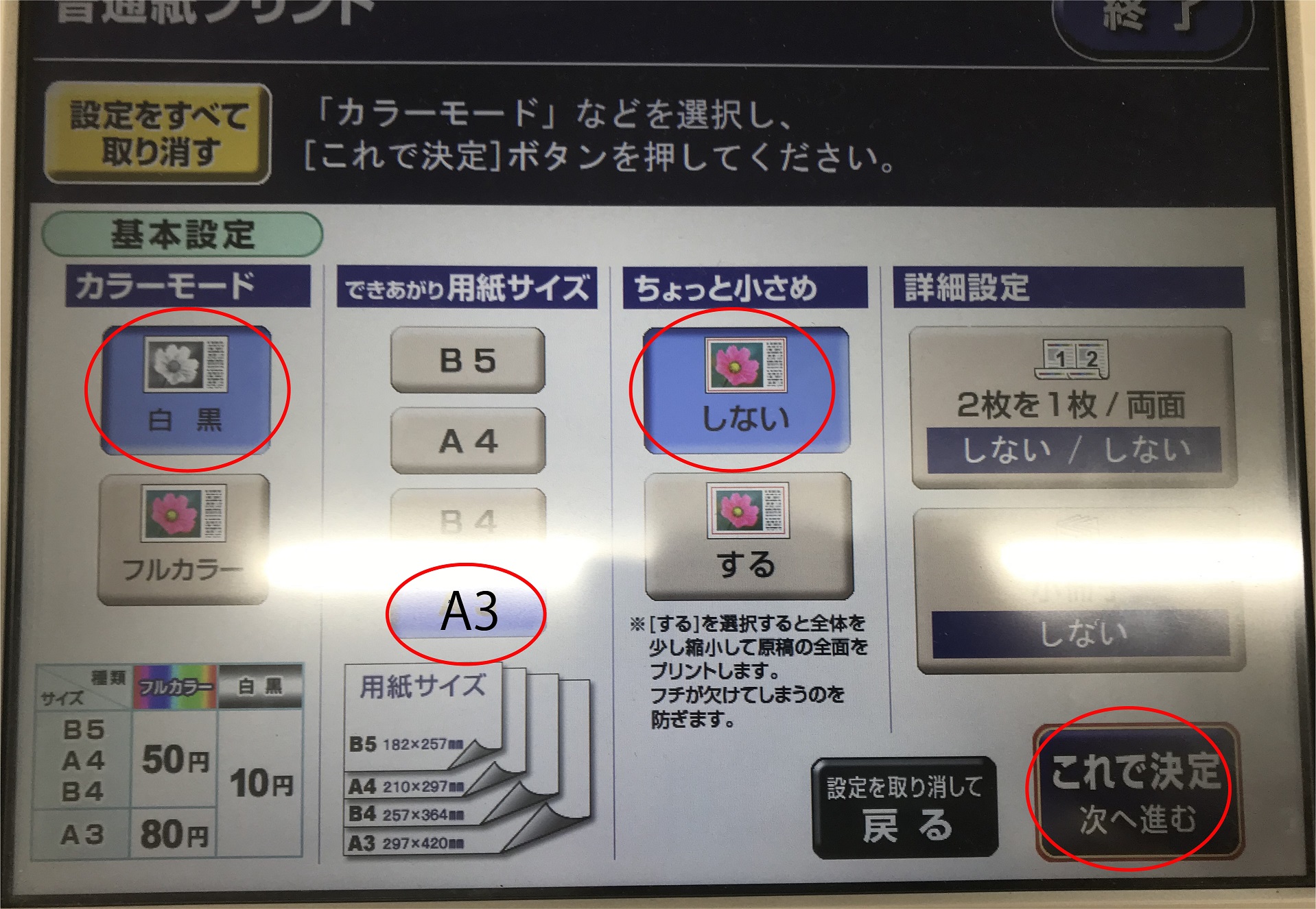 * 白黒(モノクロ)、用紙サイズ→ A3サイズ、 ちょっと小さ目→しない、です